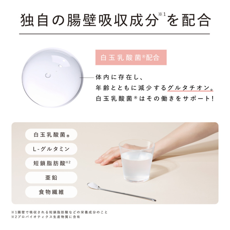 今話題の白玉乳酸菌と、腸壁で吸収される短鎖脂肪酸が肌のターンーオーバーや腸のもれ(リーキーガット)に働きかけます。