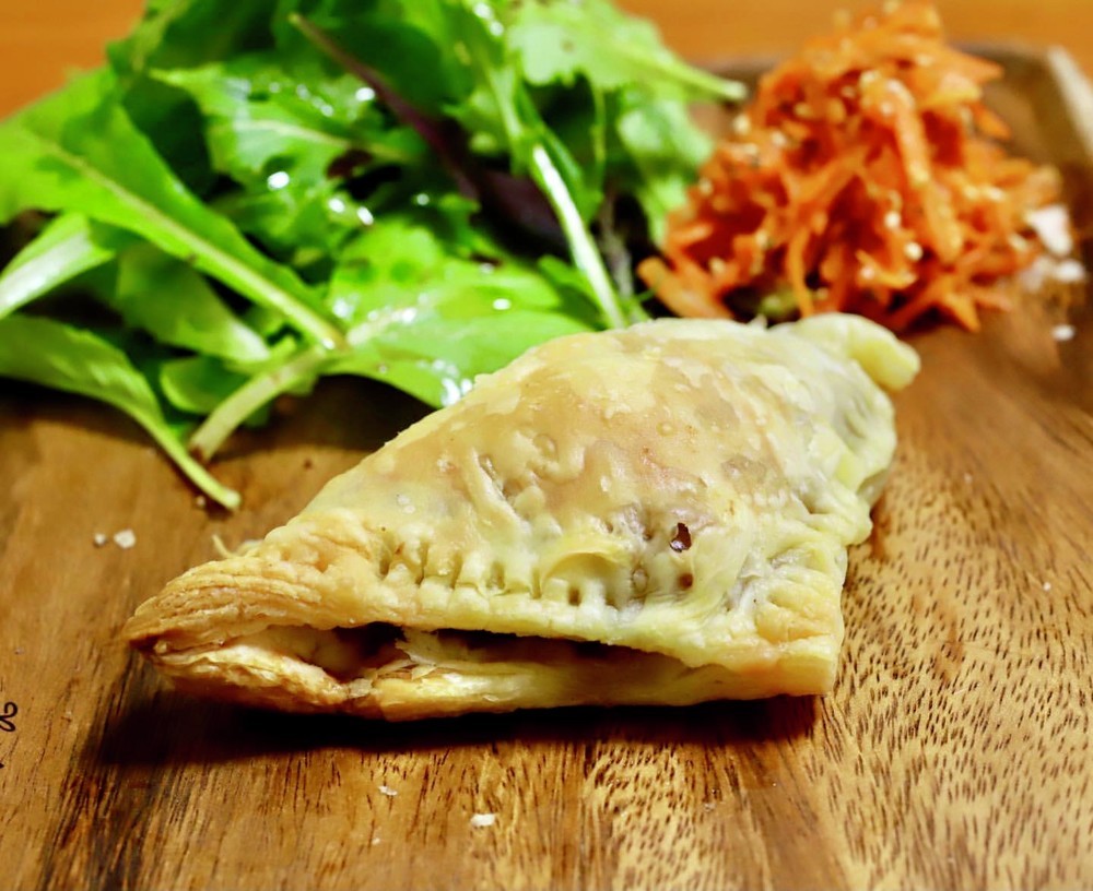フォークで端を押してくっつけたら、200度に予熱したオーブンで、こんがりするまで20分ほど焼く。三角パイの出来上がり。