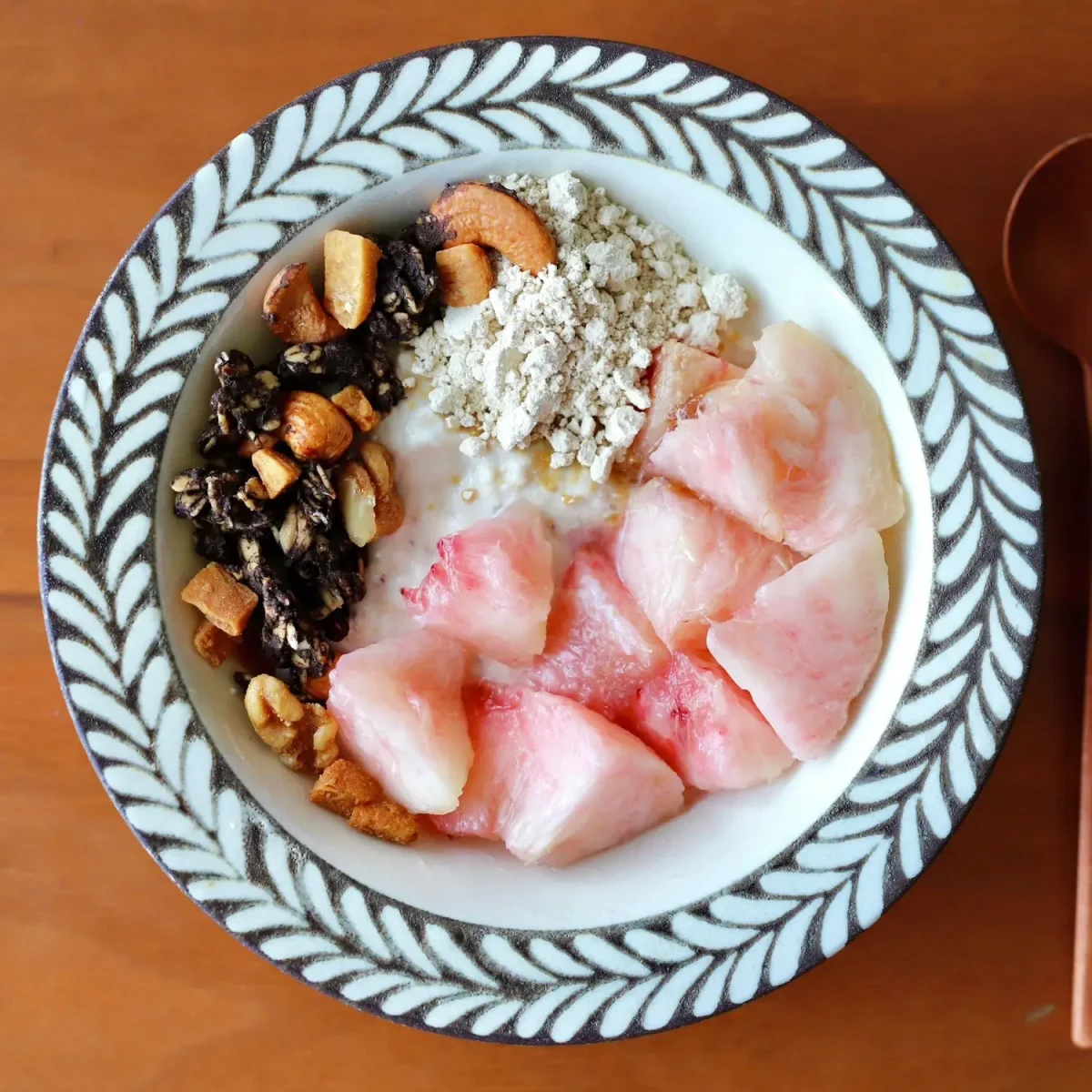 食べる時に桃、グラノーラ等をトッピングして食べましょう。