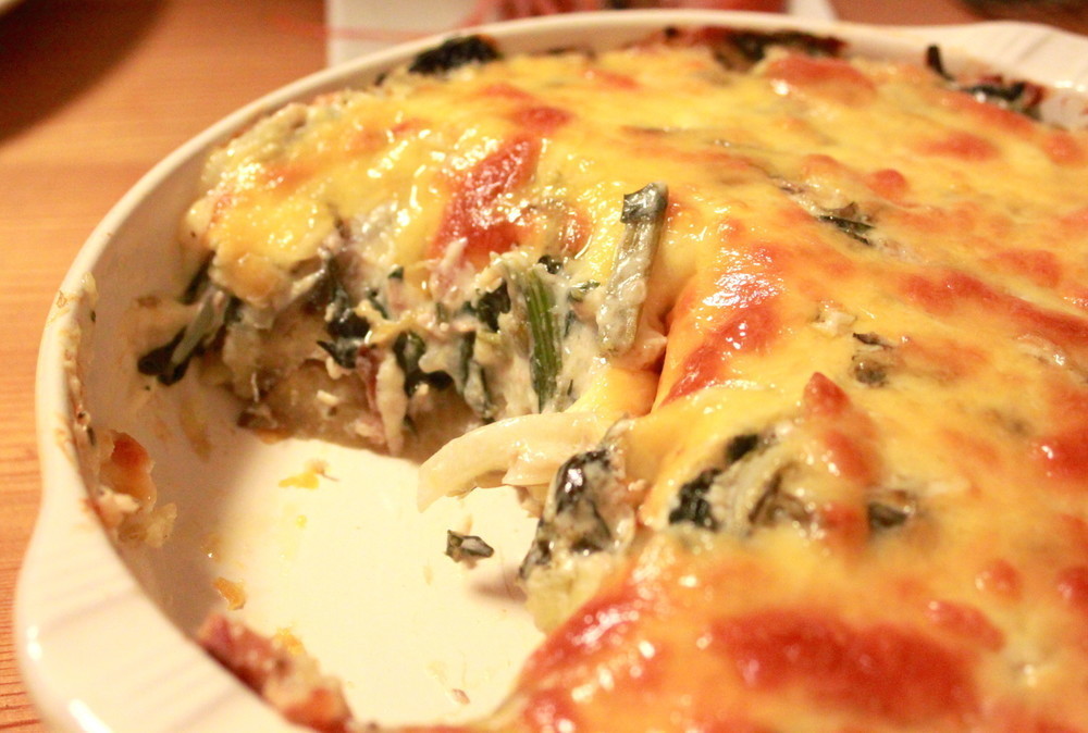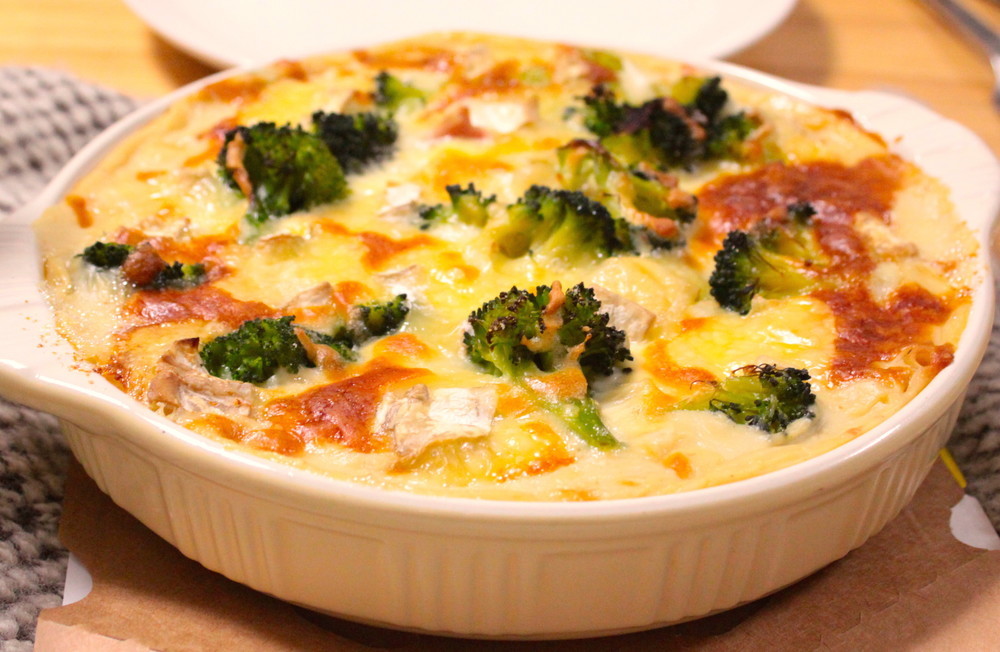 「米粉ホワイトソース」でグラタンのベースを作り、その上に酒粕チーズをたっぷりのせて焼きます。