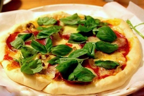 ピザの上にのせて焼くと、くず粉の効果でとろっとしたチーズのような感じに。