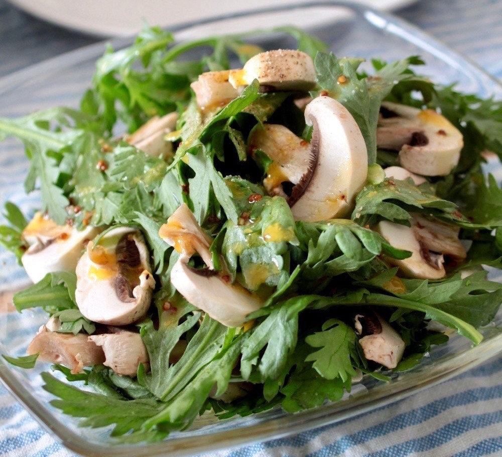 やわらかな生のマッシュルームと、やわらかな春菊の葉、