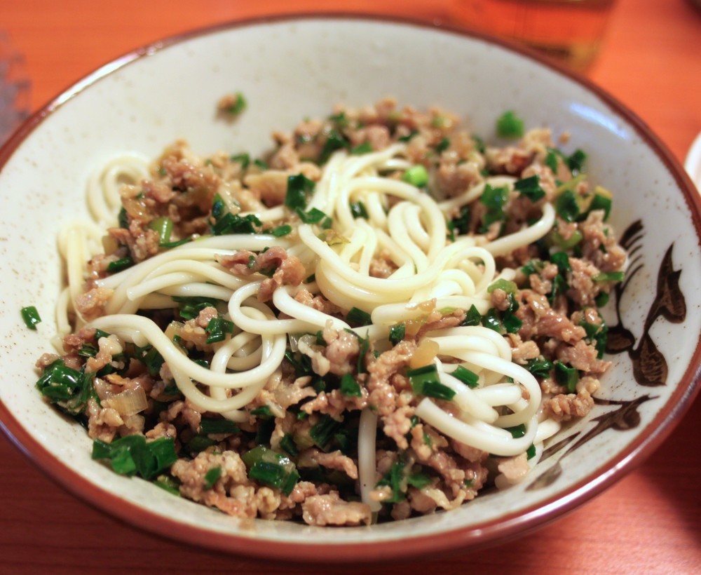 塩・こしょうで炒めたひき肉と、ニラだれを和えるだけです。