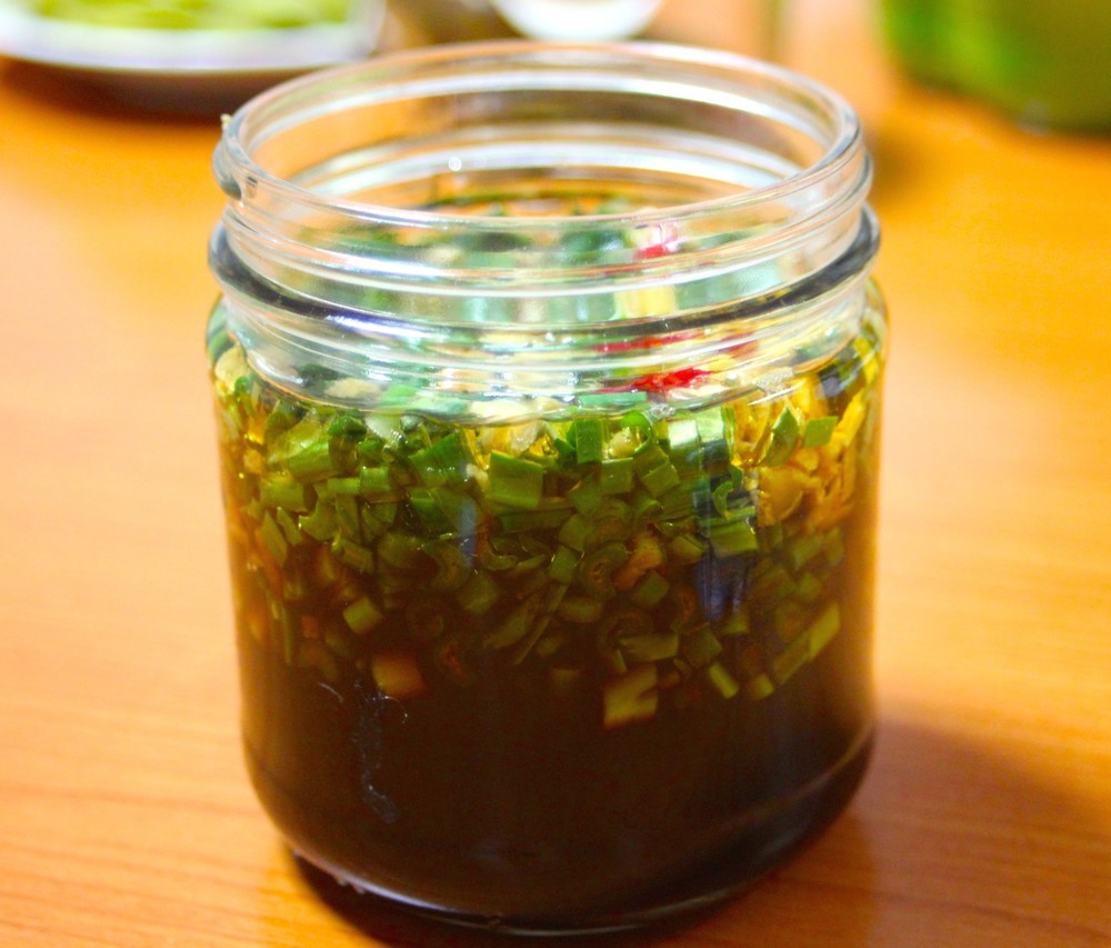保存びんにニラと生姜を詰め込んだら、調味料をひたひたに注ぎこんでいきます。