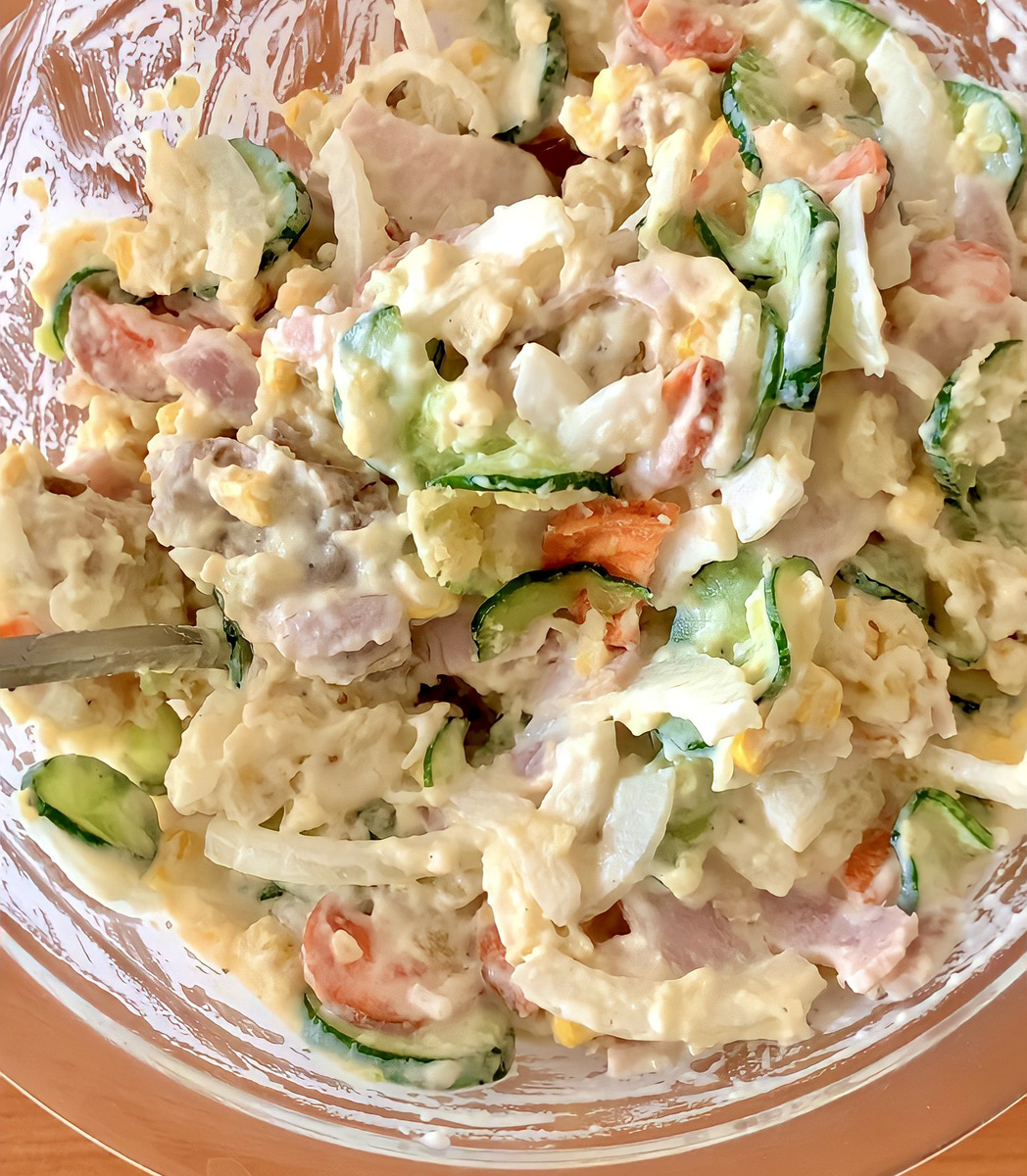 私のポテトサラダはじゃがいもよりきゅうりなどの具材の方が多いぐらいの配合。