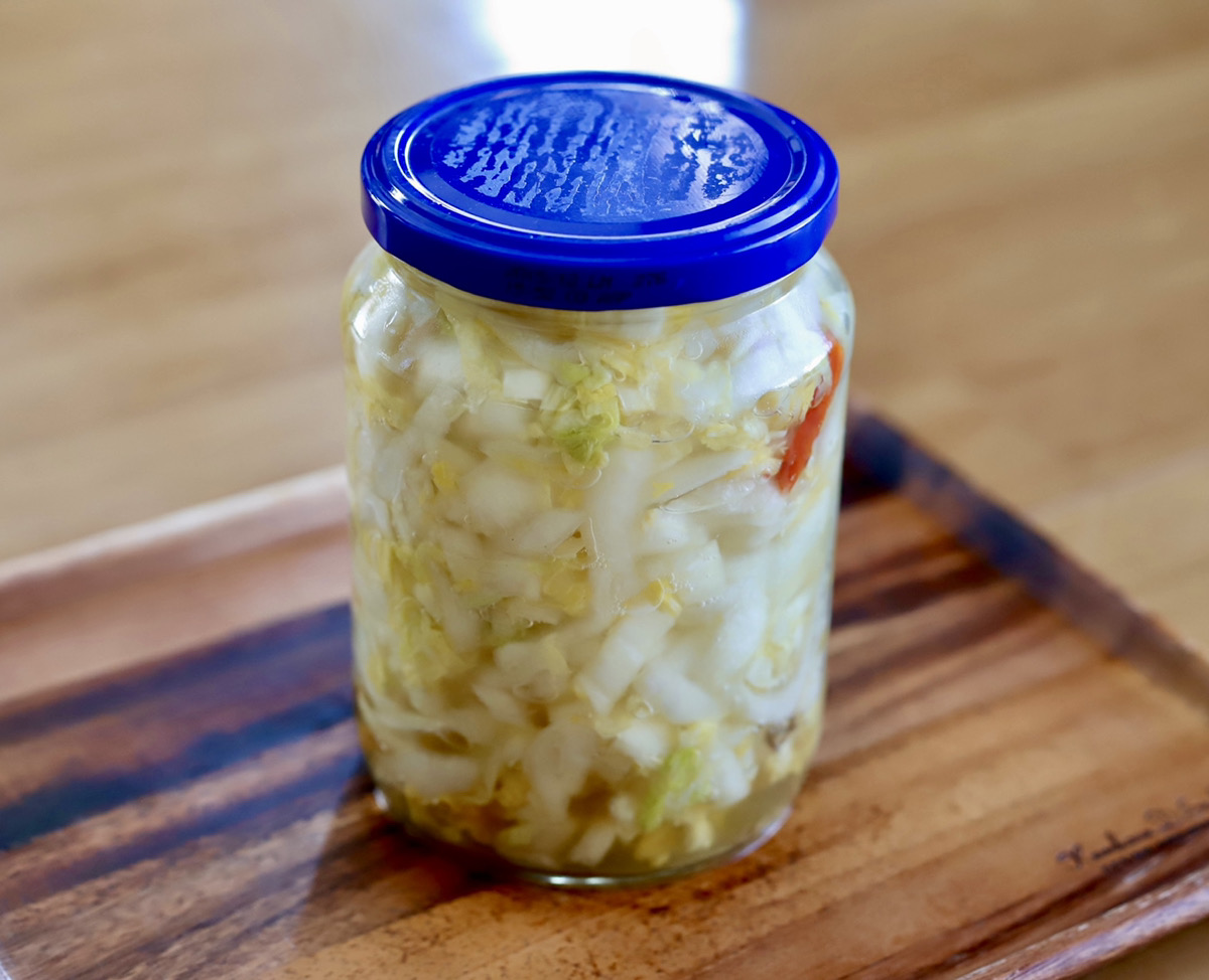 (もしキャベツの量が少なくてビンに空間がある時は、キャベツの上にオーブンシート等をかぶせて、キャベツが空気に触れないようにしてからフタをしめましょう。)