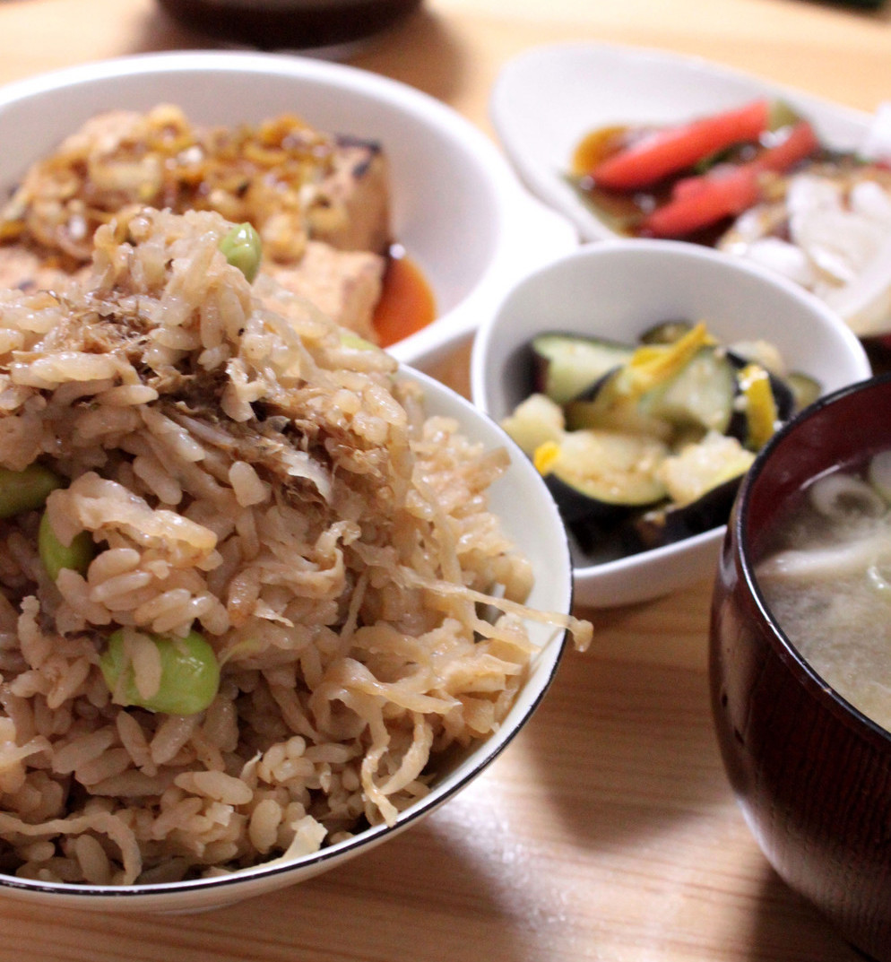 ※炊き上がりに枝豆やかつお節などを混ぜ込むと美味しい。たっぷり。