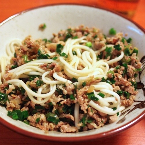 フライパンにごま油を熱し、生姜、ニンニク、(好みで豆板醤)を炒め、香りがたったらひき肉を加える。