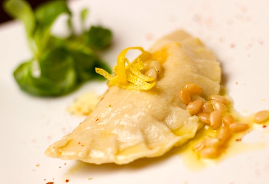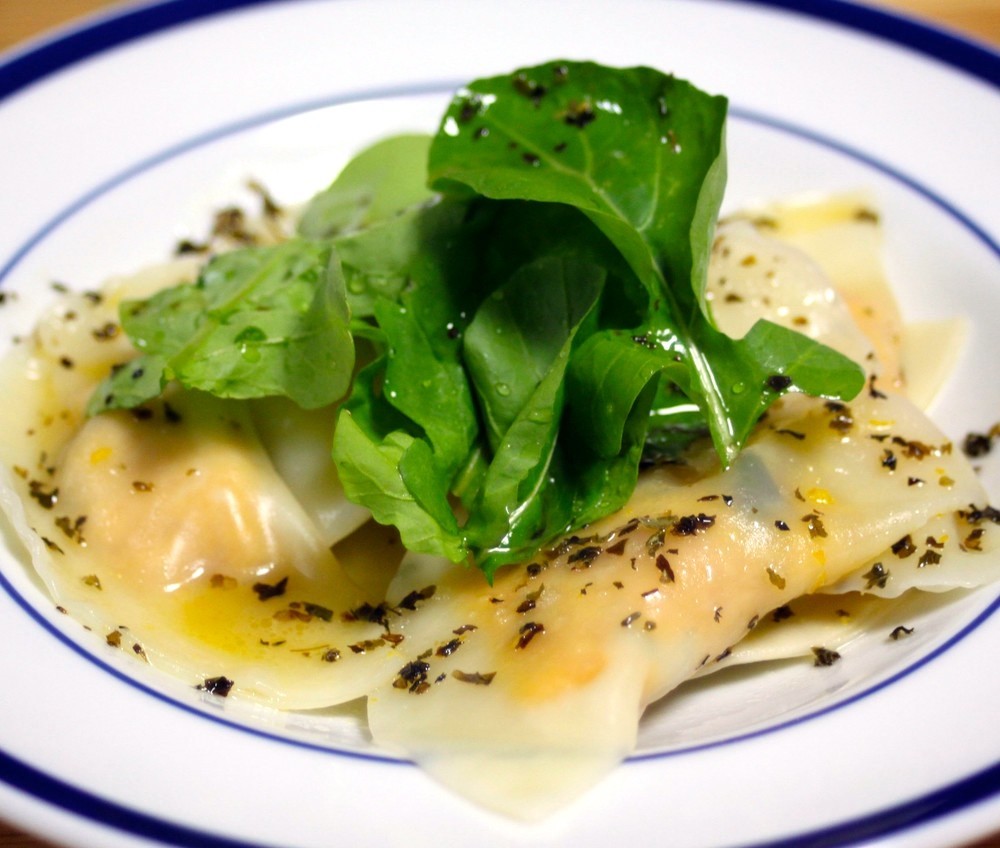 最後に醤油をジャッとまわし入れて、ゆでたてのラビオリにかけるだけ。