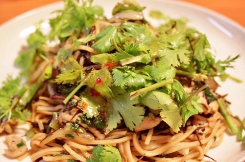 皿に盛り、刻んだピーナツ、フライドオニオン、パクチーをたっぷりのせ、スイートチリソース、ナンプラーをかけていただきます。