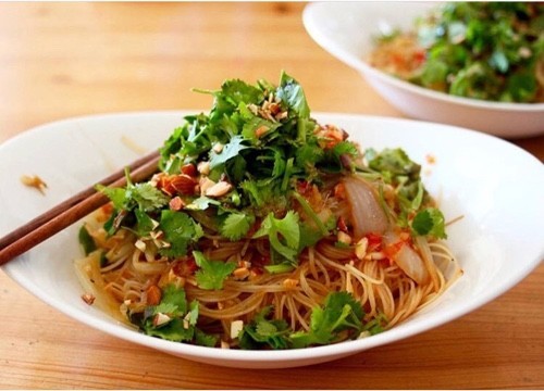 お湯で戻したビーフンにパクチーやピーナッツや海老など、好きな具材と好きな調味料を混ぜるだけ。