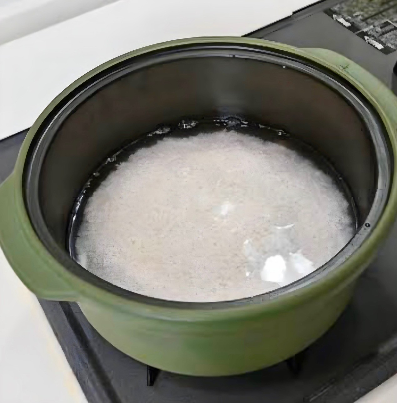 【土鍋で炊く場合】土鍋に米を入れ、調味料を加えてから米と同量の水(2合)+大さじ1の水を入れ、30分浸水させる。